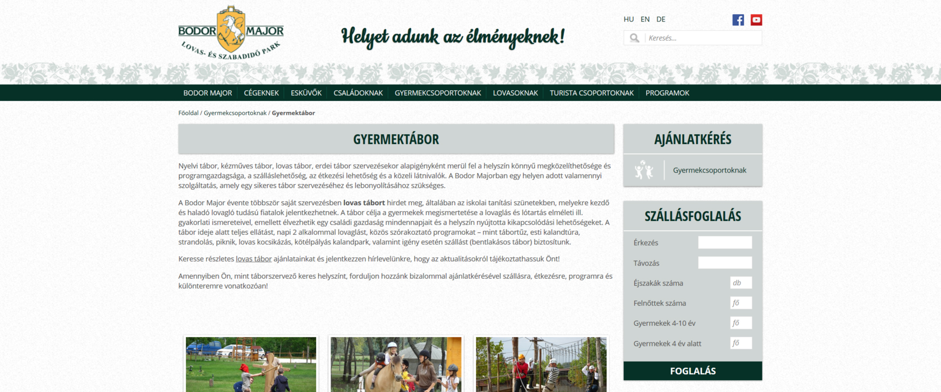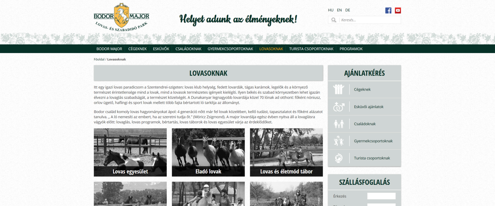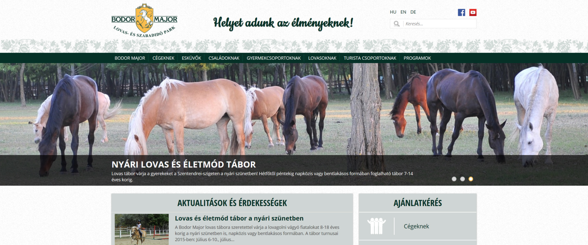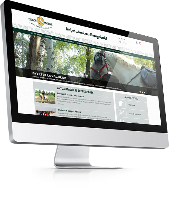 A Bodor Major egy 2008 óta üzemelő lovas és szabadidő park, ahol 50 hektárnyi területen számos tradicionális program közül válogathatnak az oda látogatók. Tevékenységi körük rendkívül széles palettán mozog, hisz a céges rendezvényektől, az esküvőkön át a családi üdülésekig rengeteg lehetőség közül válogathatnak a kikapcsolódni vágyók. Feladatunk egy olyan WordPress alapú portál elkészítése volt, ami kinézetével is képviseli a tradicionális magyar értékeket. A modernizálás érdekében elláttuk az oldalt You Tube, illetve Facebook integrációval is, illetve a külföldi vendégek csalogatására a magyaron kívül további két nyelven is elérhető az oldal.
