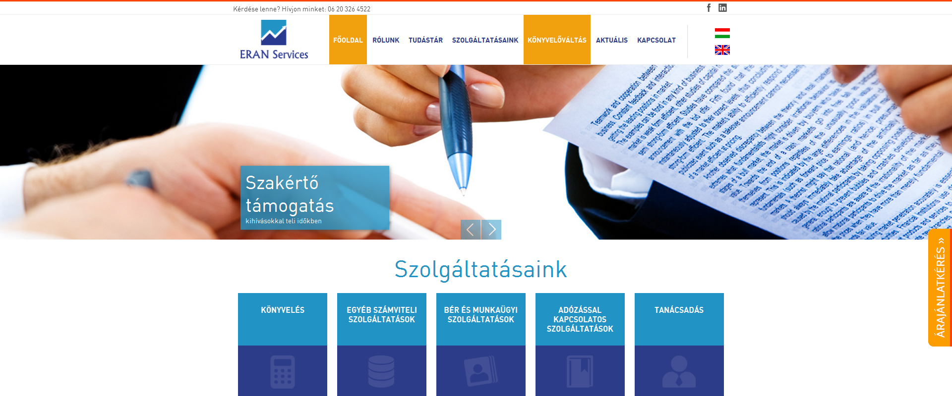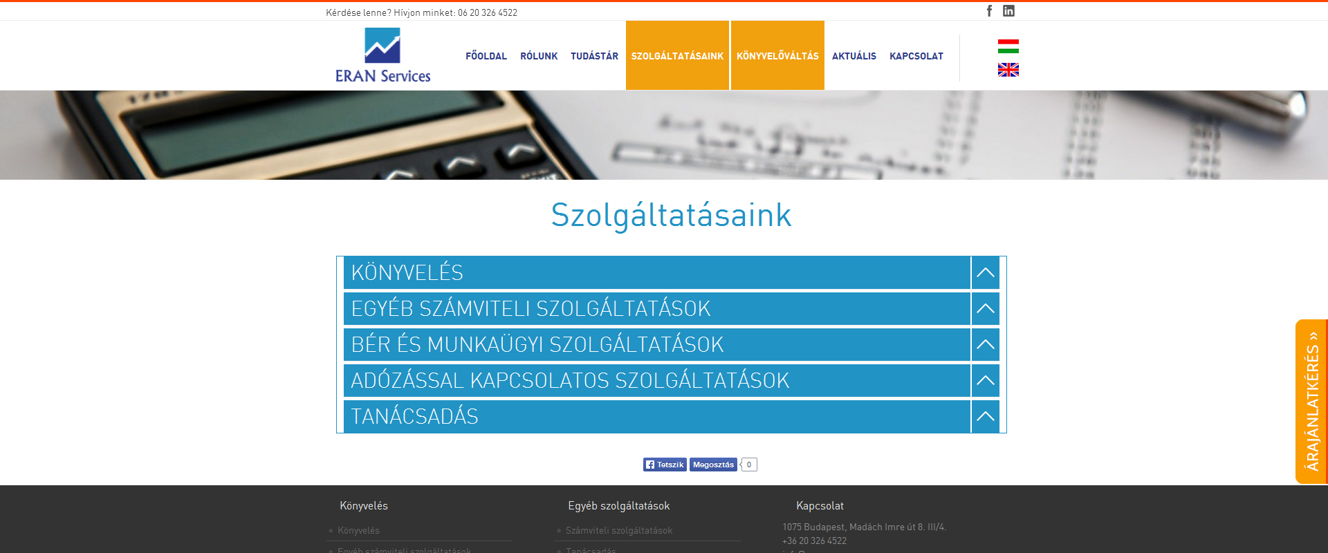 A weboldal a céget és szolgáltatásait mutatja be elsősorban ügyfélszerzési céllal, ugyanakkor létrejött egy tudástár hasznos oldalakkal, határidőkkel és fogalmi magyarázatokkal is az ügyfelek részére. A részletes árajánlatkérő form segítségével az új ügyfelek beküldhetik pontos igényeiket és minden információ rendelkezésre áll a gyors árajánlat adáshoz. Természetesen ez az oldal is reszponzív kivitelben készült, mobilmenüvel és dinamikus képernyőméretezéssel.