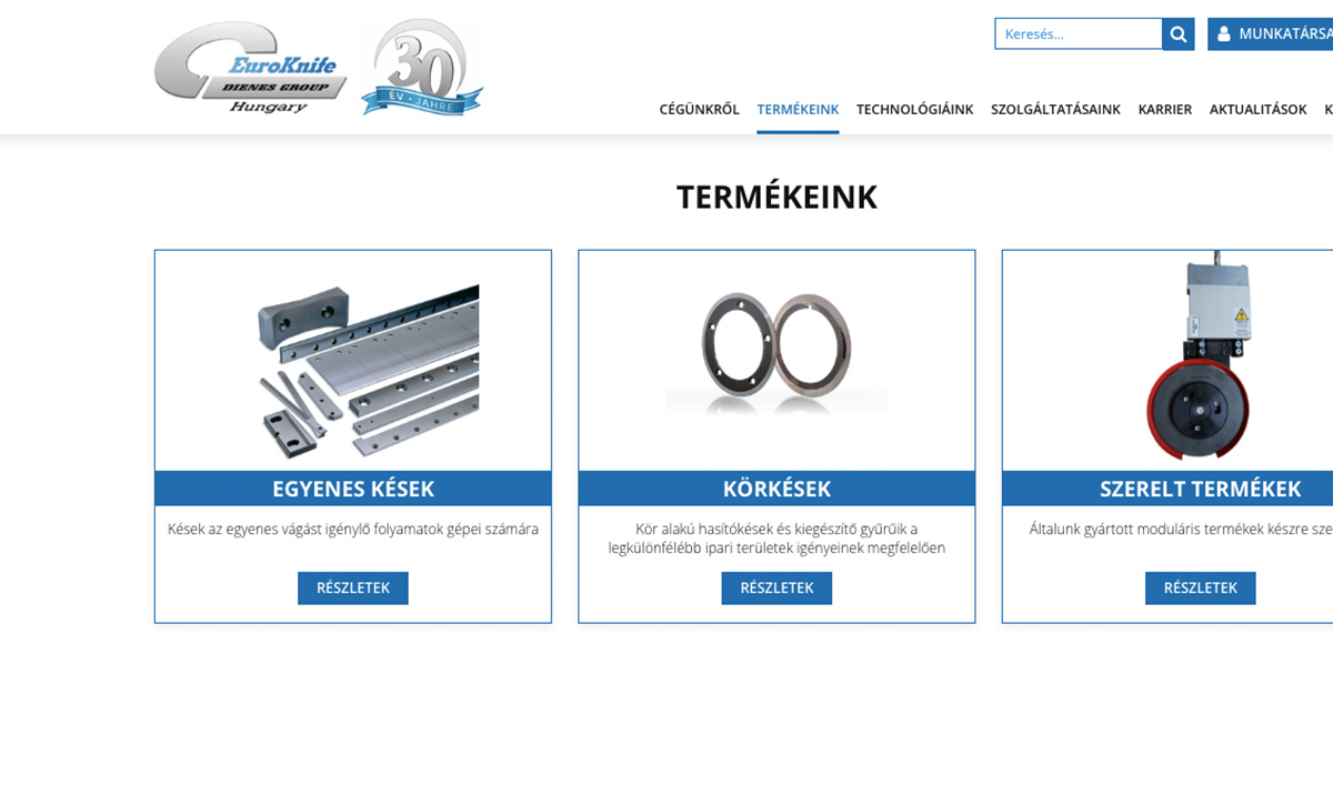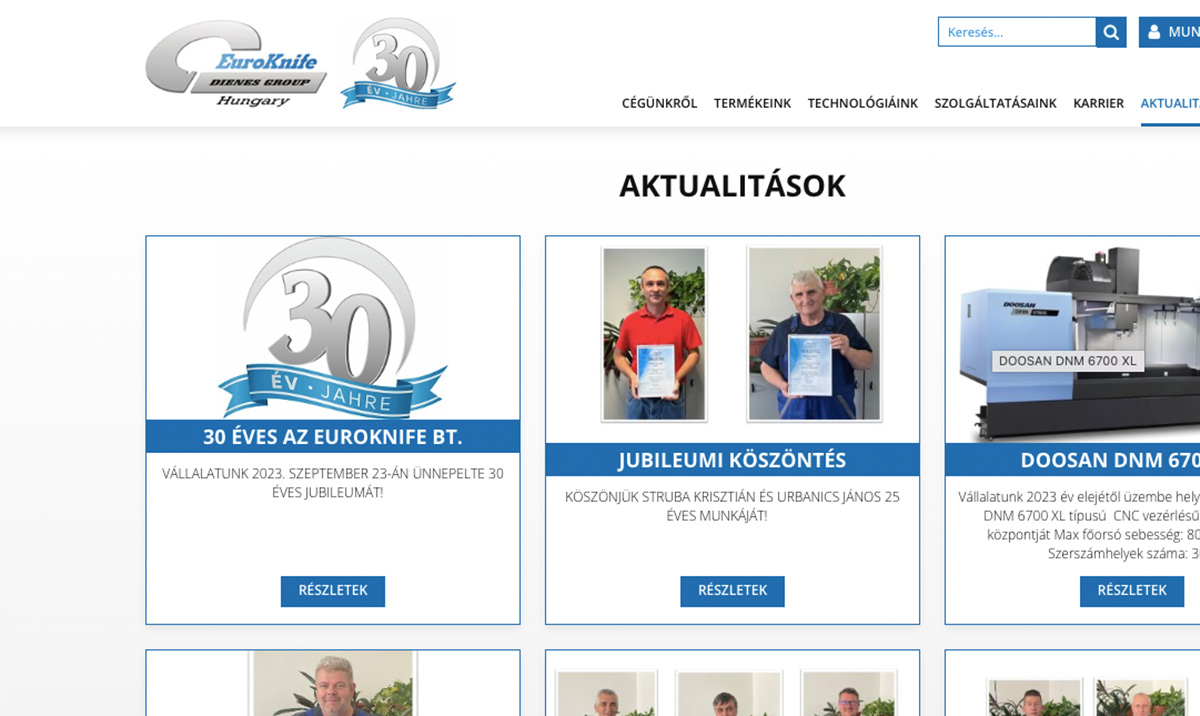 Az Euroknife német családi vállalkozás weboldalát újítottuk fel, a korábbi oldal elemeinek újragondolásával. A weboldalon a bemutatkozáson kívűl, termékek, szolgáltatások és a kapcsolatfelvételi lehetőségek is feltűntetésre kerültek.