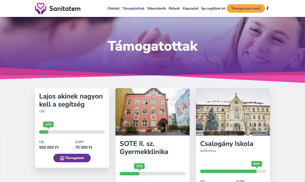 A Sanitatem Alapítvány számára bemutatkozó jellegű weboldalt készítettünk. A weboldalon keresztül a felhasználók elküldhetik adományozási szándékukat. A honlapon megjelennek adományozási tételek a kitűzött céllal, illetve az aktuális adományozási összeggel. A weboldal készítés során WordPress alapú tartalomkezelő rendszert használtunk, egyedi design-t terveztünk és mobil eszközökre optimalizált felhasználói felületet hoztunk létre.