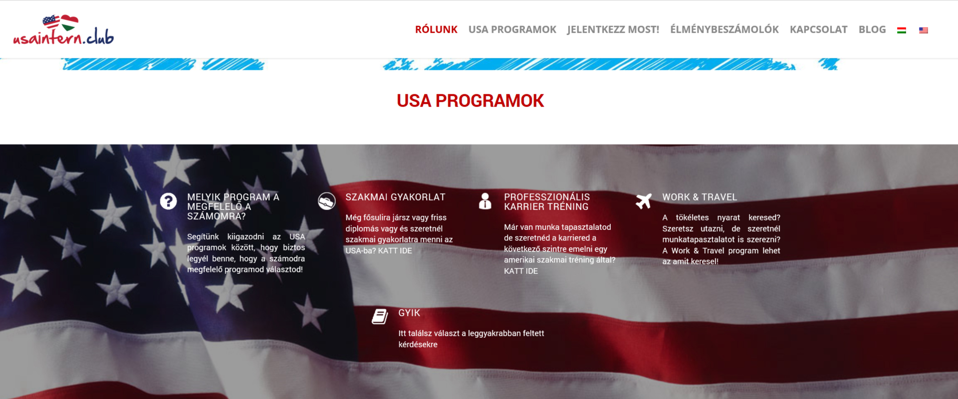 Az USAintern.club különleges lehetőséget biztosít azon magyar fiatalok számára, akik fontosnak tartják a szakmai fejlődést, illetve tapasztalatszerzést. A programban nem csak főiskolások, illetve egyetemisták vehetnek részt, hanem olyan fiatalok is, akik a felsőoktatásban megszerzett tudásukat szeretnék gyakorlati tudással is kiegészíteni. Ezt a mentalitást és gondolkodásmódot vittük tovább a kétnyelvű, WordPress alapú parallax típusú reszponzív weboldal elkészítése során, amely a fiatalos design mellett a szakmai profizmust sugározza. Az oldal rendelkezik bloggal, social media integrációval, továbbá a hírlevelükre való feliratkozás lehetőségével.