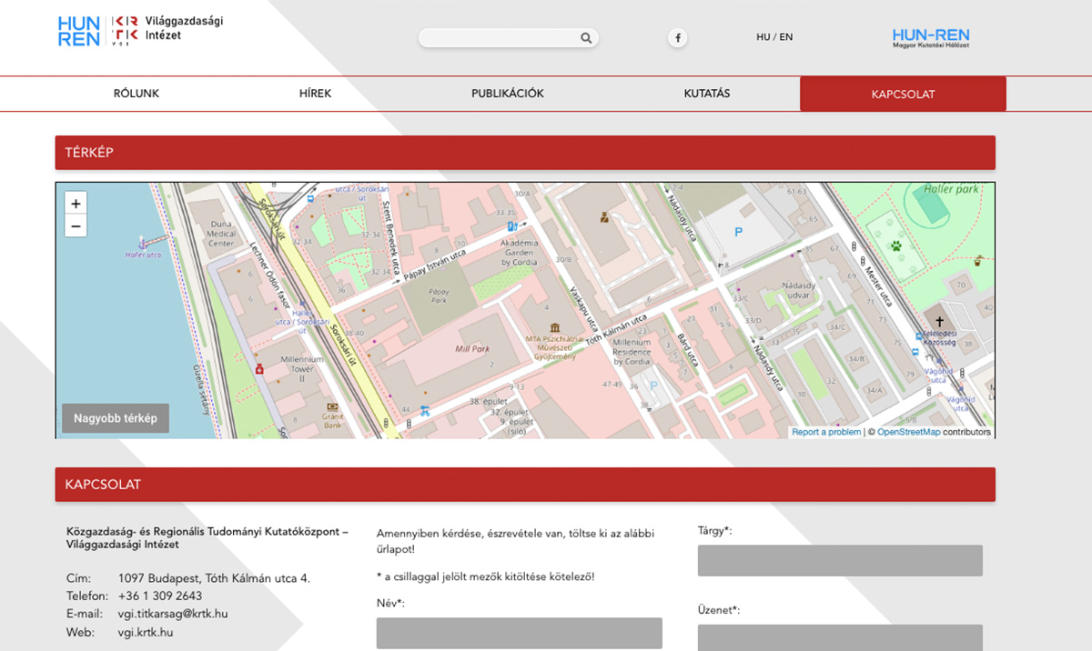 A Közgazdasági- és Regionális Tudományi Kutatóközpont megbízásából egy bemutatkozó weboldalt készítettünk, mely magába foglalja az alintézményeket is. Az oldal eseményeket, publikációkat, híreket és szervezeti adatokat mutat be a felhasználóknak. WordPress alapú php motor felhasználásával egyedi design alapján készült az oldal.