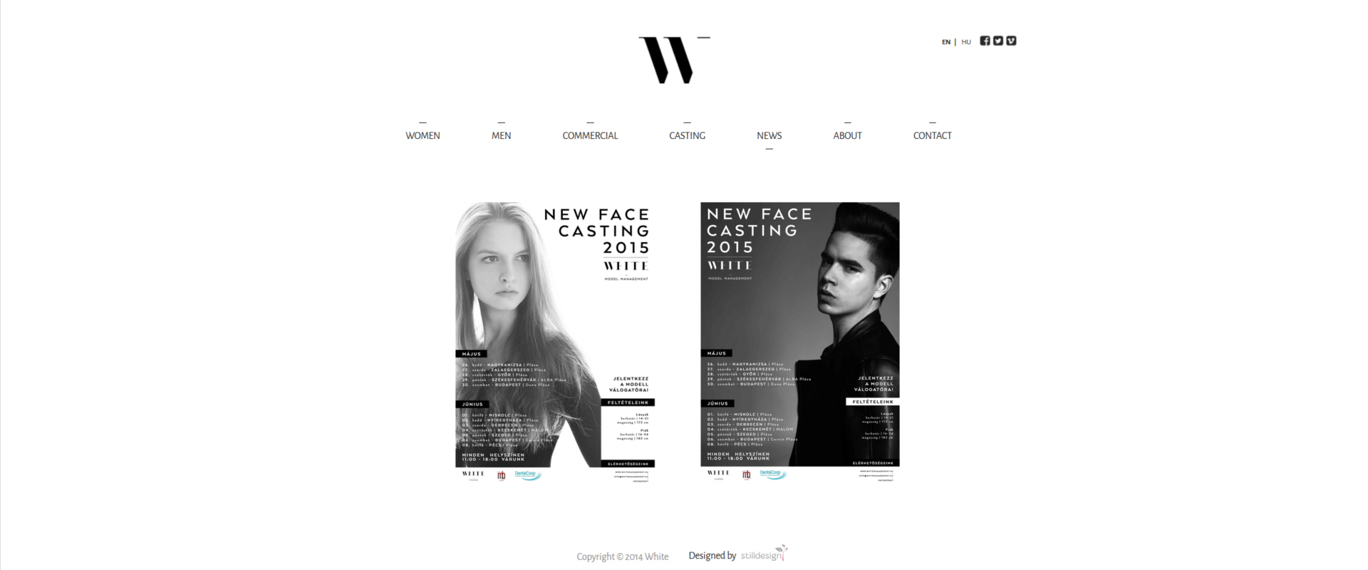 A White Model Management 2015 óta nyújt teljes körű professzionális szolgáltatást a divat szférában. A modellek karrierjének egyengetése mellett a White Studios-zal karöltve rendkívül magas színvonalú munkát végeznek a fotózásoktól egészen a PR tevékenységekig. A minimalista, letisztult design a kevesebb több elvét követi. A kétnyelvű, reszponzív, WordPress alapú oldal tökéletes böngészési élményt nyújt mobilon és tableten egyaránt. A beépített social media integrációnak hála pedig könnyedén rájuk találhatunk más platformokon is.